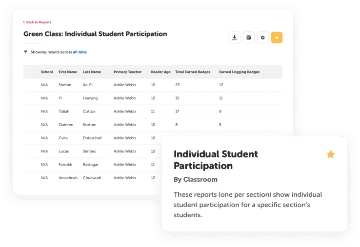 Easy-to-use dashboards and reports give insight into daily reading progress for individual students, classes, and teachers during a specific time frame or for the entire school or district during the school year. You can monitor reading goals, target your interventions, and report on reading gains.