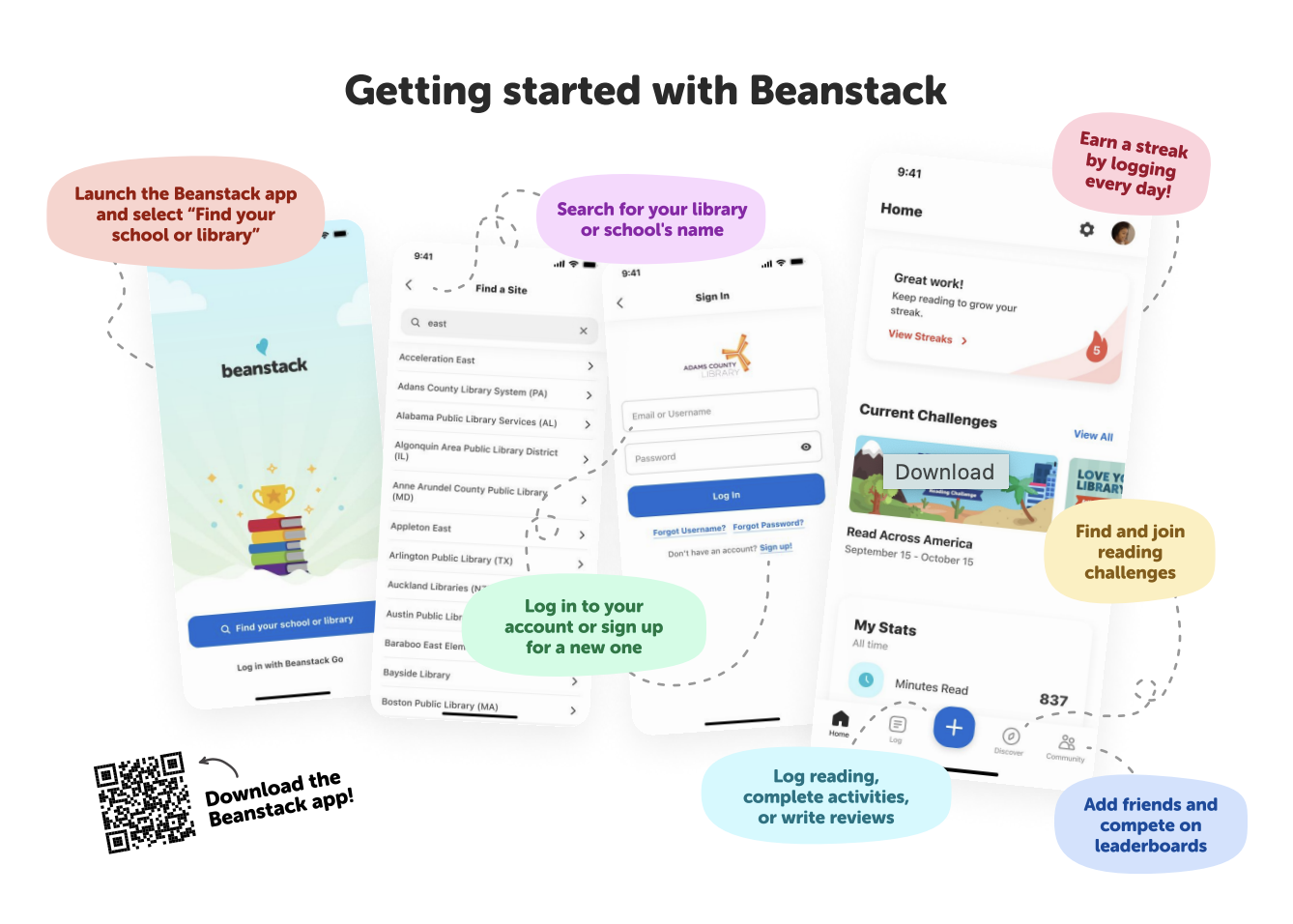 Here, you'll find postcards and printables advertising the Beanstack mobile app. All Beanstack clients are welcome to use these materials!